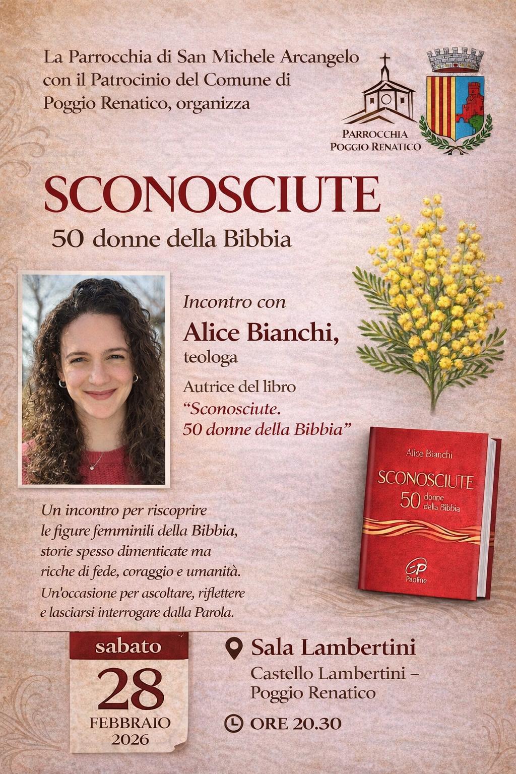 Presentazione del libro: SCONOSCIUTE: 50 donne della Bibbia - Sabato 28 febbraio ore 20.30, Sala Lambertini Castello Lambertini, la Parrocchia di San Michele Arcangelo con il Patrocinio del Comune di Poggio Renatico, organizza un incontro con ALICE BIANCHI, teologa ed autrice del libro