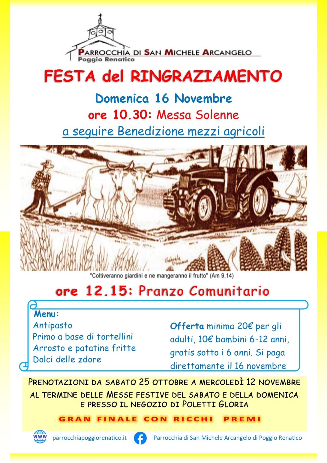 Festa del Ringraziamento - Domenica 16 Novembre 2025 ci sara' la Festa del Ringraziamento con Santa Messa ore 10.30 con benedizione dei mezzi agricoli, e pranzo comunitario alle ore 12.15
