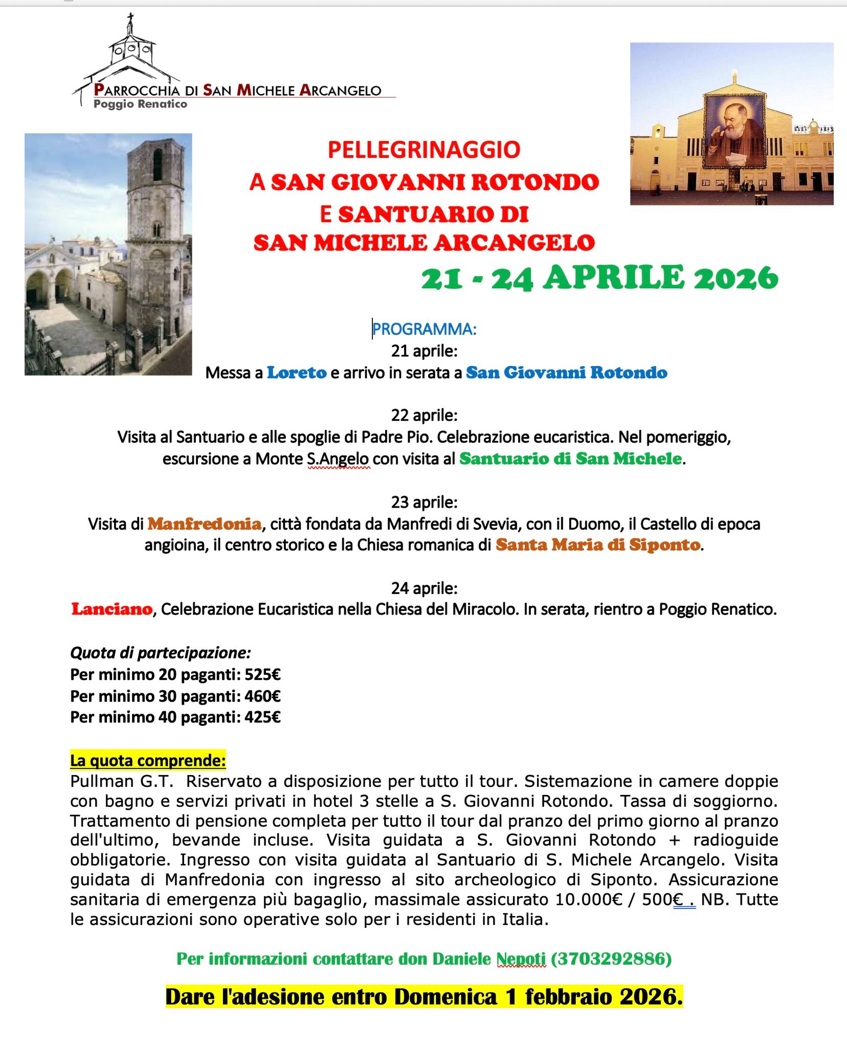 PELLEGRINAGGIO - Dal 21 al 24 aprile 2026 si terra' il pellegrinaggio a San Giovanni Rotondo e al Santuario di San Michele Arcangelo, in allegato il programma delle giornate e le quote di partecipazione - Adesioni a Don Daniele entro domenica 1 febbario 2026